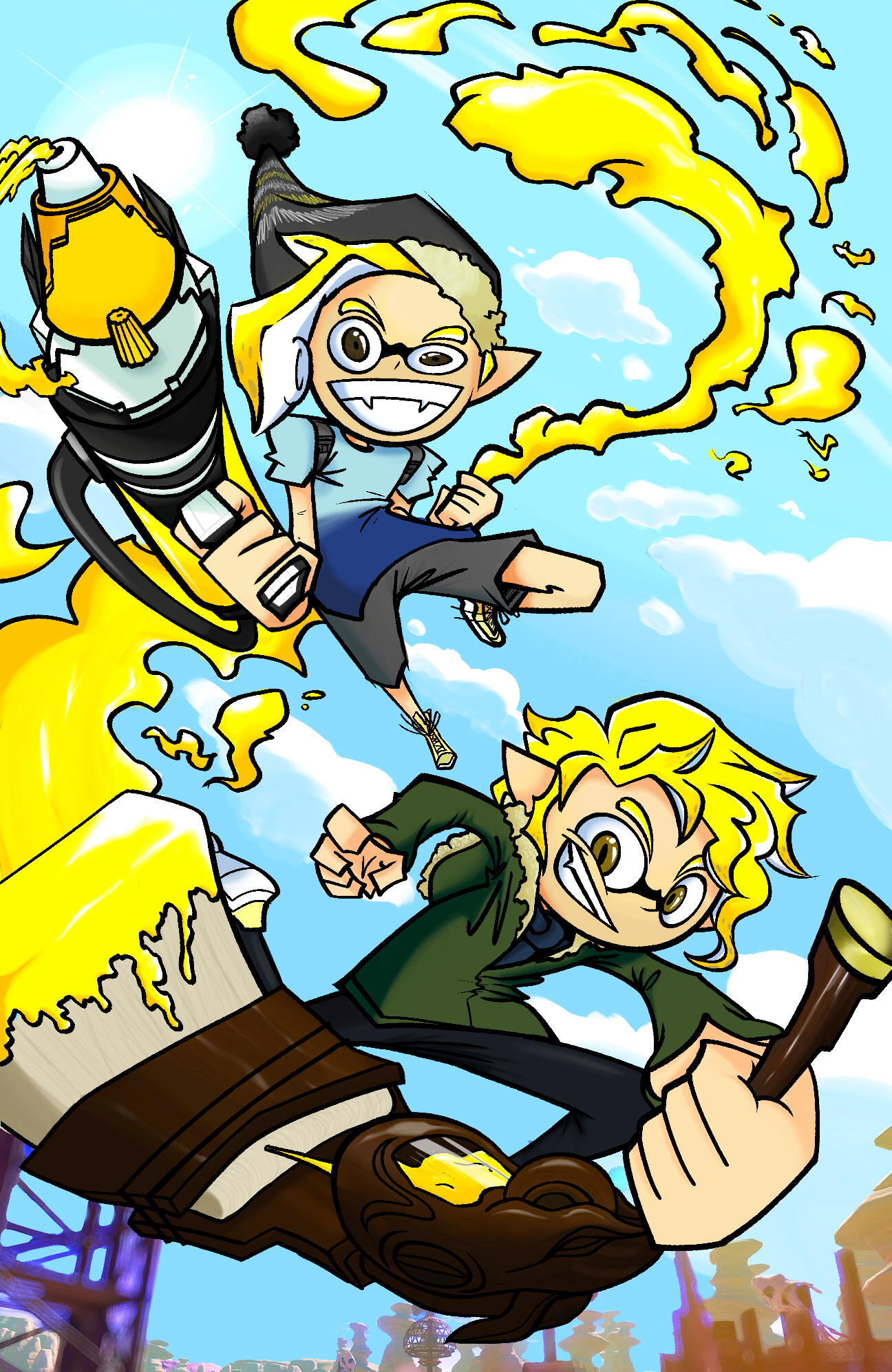 Mobile users rejoice! We have a vertical piece, and this one is the last digital drawing I did before moving to my new laptop, so like the previous I have no production photos. Either way I love how this one turned out, this is one of the few pieces where I use color, something very foreign for my art.(also apologies for being a splatoon fan)